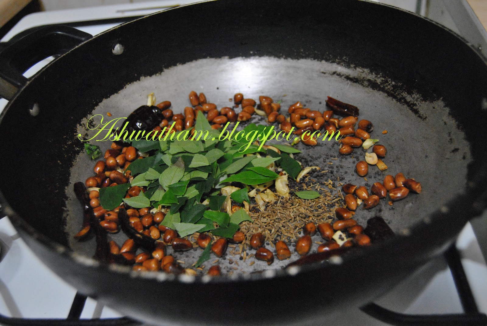 Roast everything until the garlic gets browned and peanuts get crunchy.